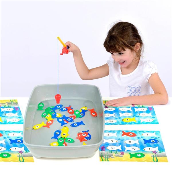 Geschikt voor 4 spelers. 40 magnetische nummervissen (1 t.e.m. 10). Elke vis is ongeveer 7 cm lang. 4 waterdichte dubbelzijdige spelborden met 2 niveaus. Nummers aan de ene kant, sommen aan de andere kant. 4 magnetische hengels (28 cm)