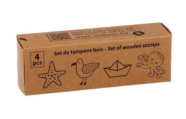 Houten stempelset in het thema onderwaterwereld. Deze set bevat 4 stempels (zeester, meeuw, bootje en octopus). Ze hebben een grootte van 2 x 2 cm. Het inktkussen is niet inbegrepen.