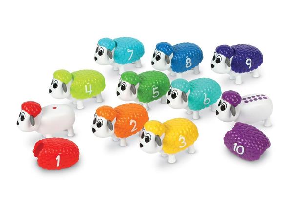 Zeer leuke tweedelige plastic schapen om het tellen van jongs af aan onder de knie te krijgen. De schapen zijn op hun rug bedrukt met een getalbeeld en op hun vacht een getal.  Er kan gecombineerd worden op zowel kleur als getal/getalbeeld. Door het in elkaar klikken van de delen worden ook de fijnmotorische vaardigheden verder gestimuleerd.  De set wordt geleverd in een handige opbergemmer.